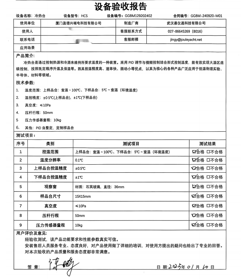 2025年1月10日,廈門盈德興磁電科技有限公司與嘉儀通達成合作,購買冷熱臺產品已順利交付。