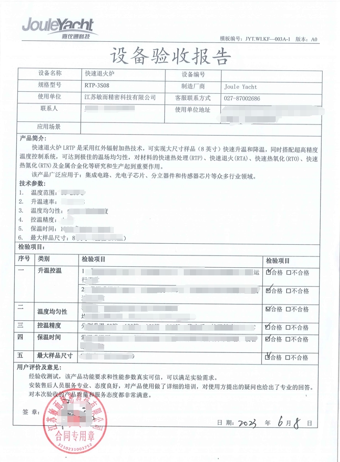 以下為江蘇敏而精密科技有限公司8吋快速退火爐的設備驗收報告: