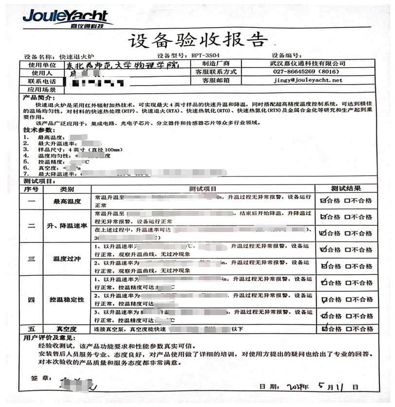 2024年5月11日,東北師范大學成功完成了一臺由嘉儀通精心研發與制造的4吋快速退火爐的驗收流程。此次驗收的順利通過,不僅彰顯了嘉儀通產品的卓越品質,更意味著嘉儀通與東北師范大學的合作自此邁向全新高度 。