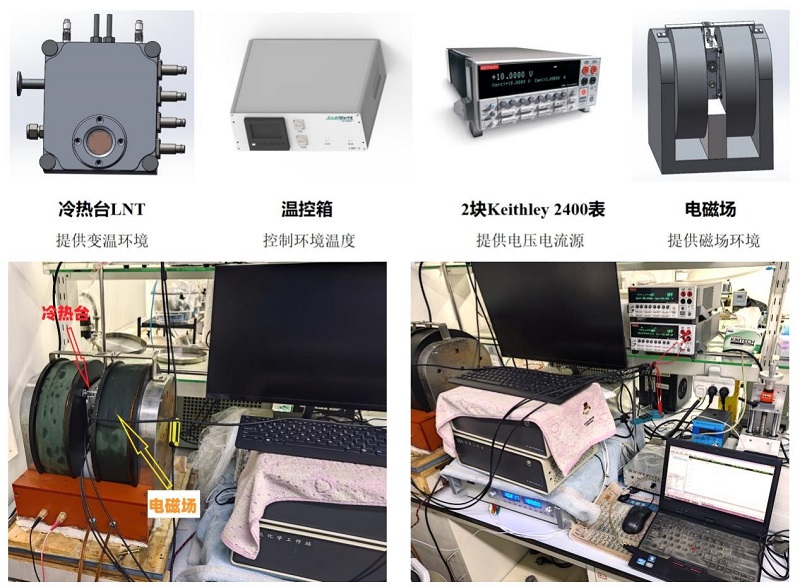 上海同濟大學用冷熱臺LND設備放入電磁場中,連接2塊Keithley 2400表,在80K~RT溫度范圍下,進行變溫霍爾效應、磁阻測量。此次實驗的成功,也驗證了冷熱臺與數字源表聯用在電磁場中測量變溫霍爾參數的可行性和準確性。